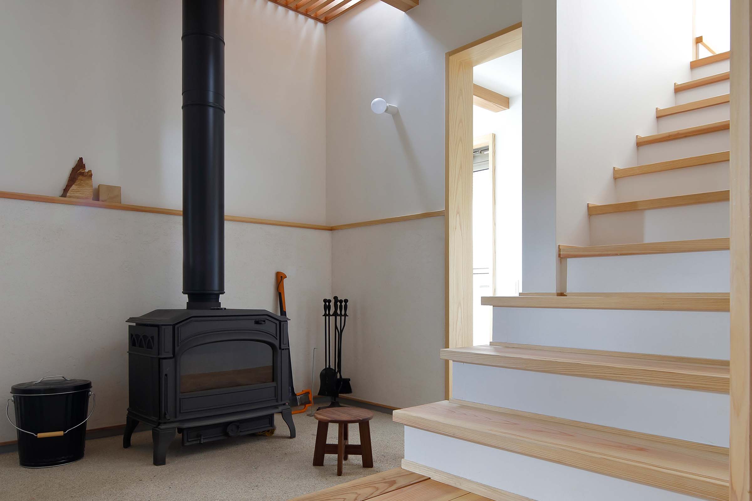 ご主人の趣味の時間を過ごす1階の土間には薪ストーブがあります。