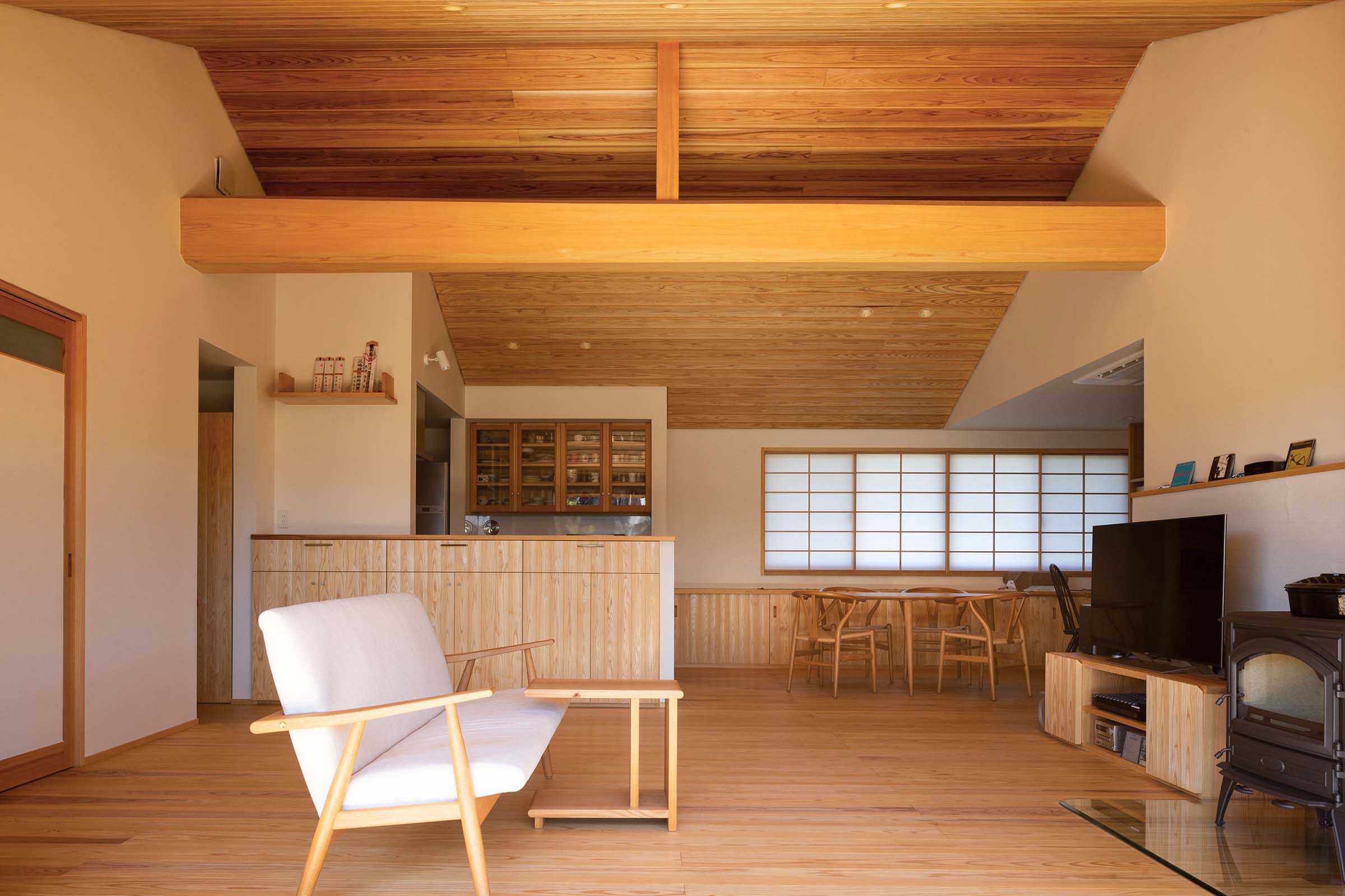 居間を支える中引梁には、建主家族と茨城の最北・八溝山系の山林にて採取した桧丸太を配しました。