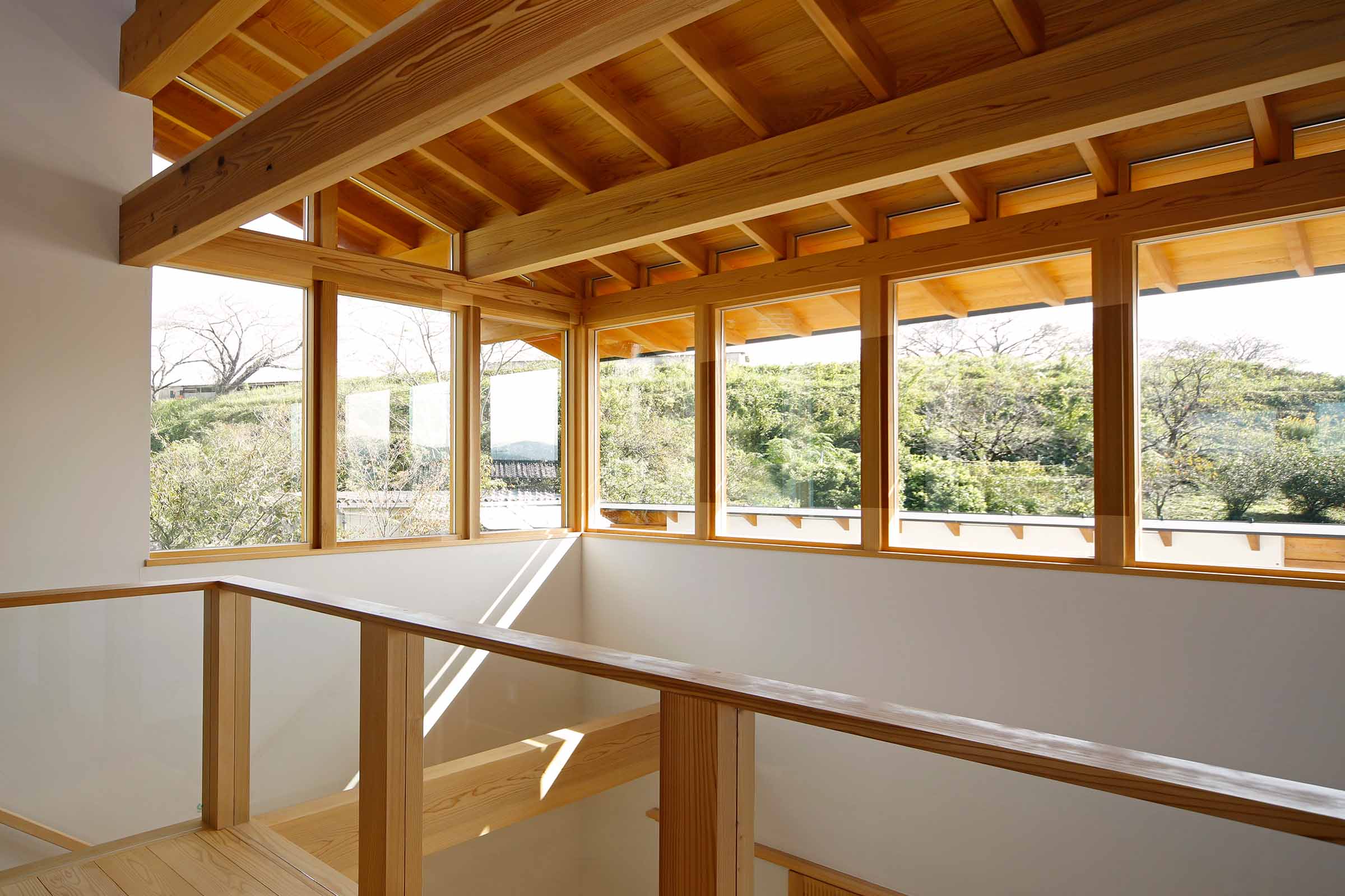 敷地の周囲は丘陵の山野草や果樹が茂る傾斜面に囲われ、その縁辺部には建主の原風景であるサクラが並びます。