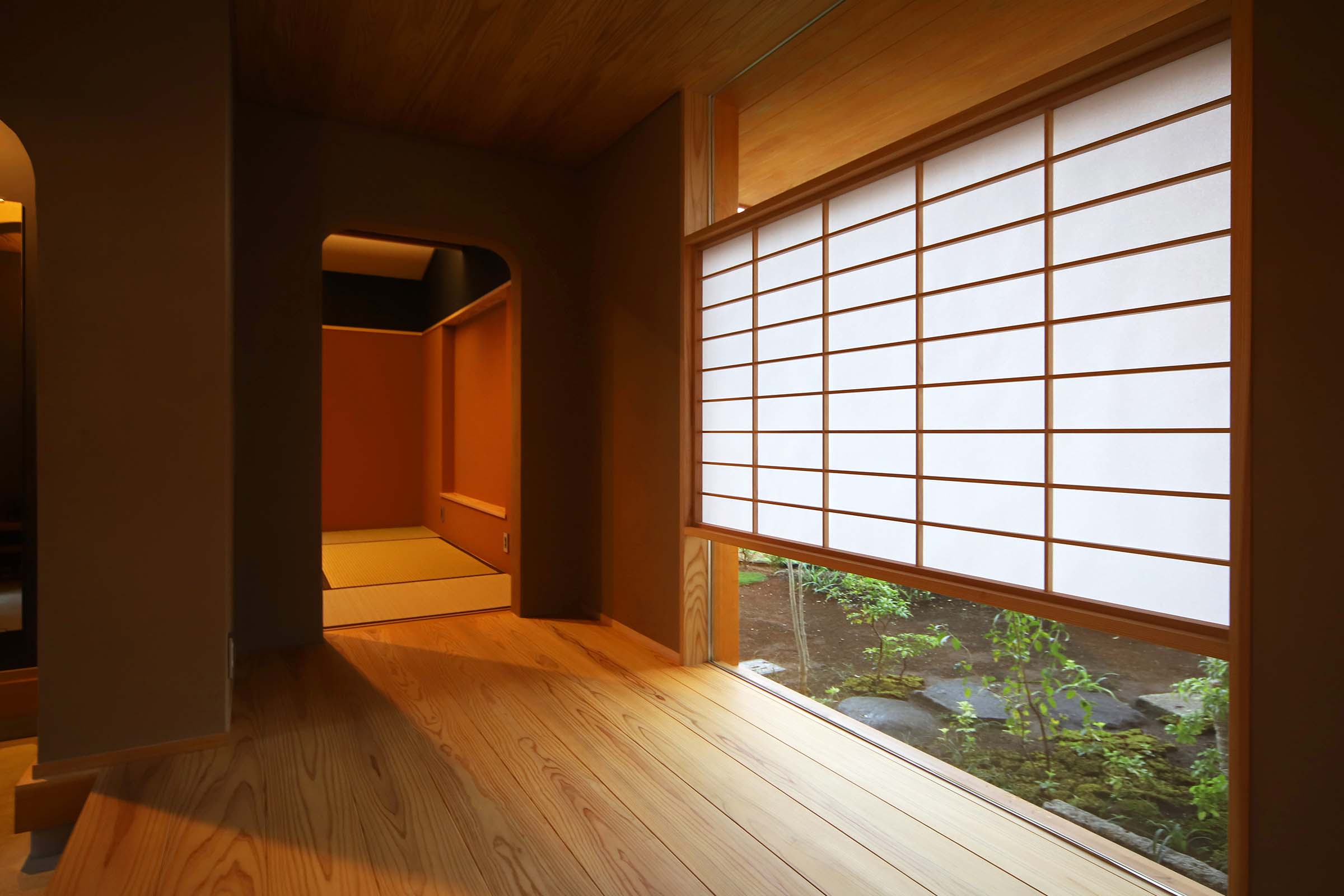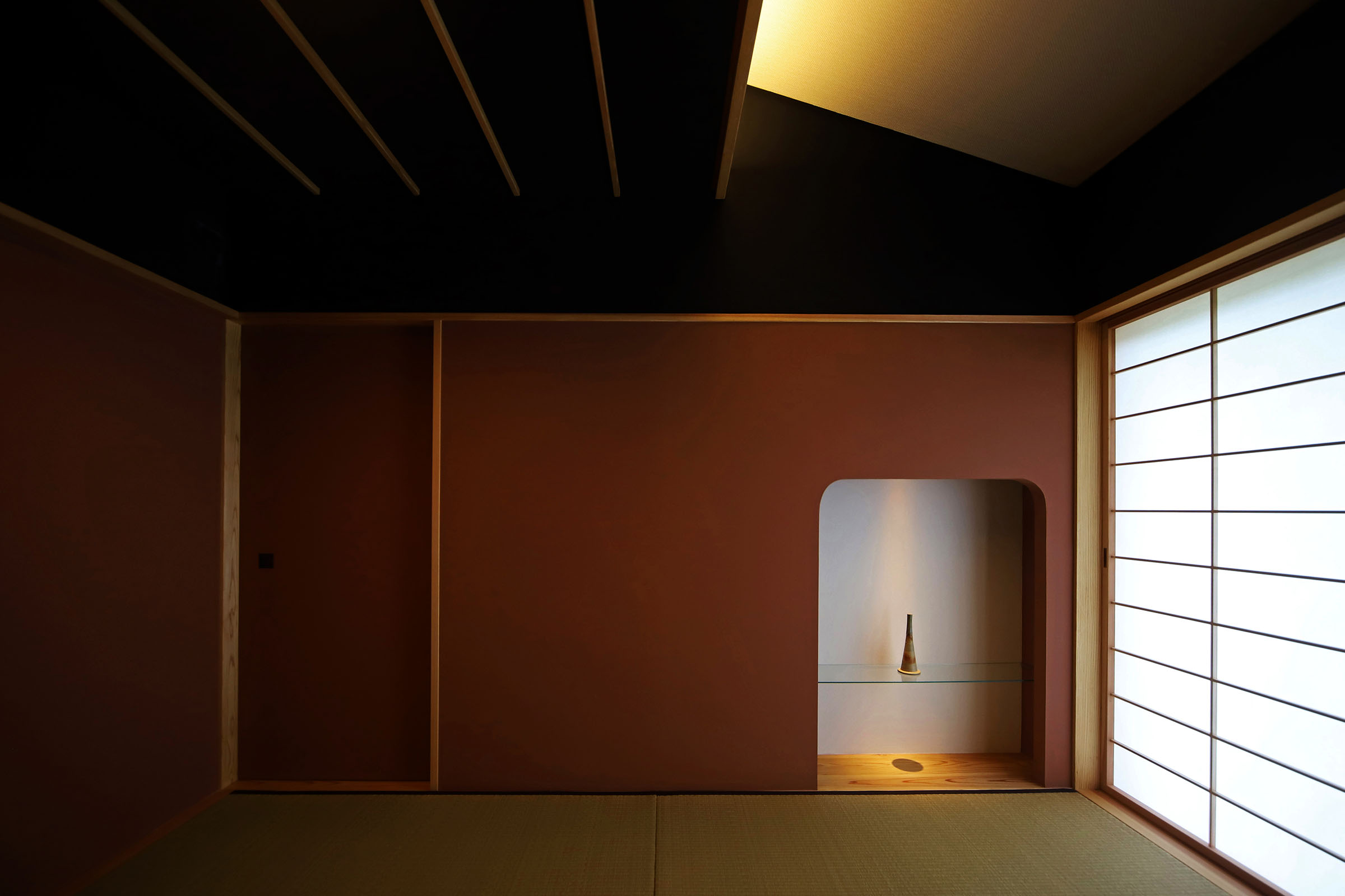 一方で和室においては傾斜面を直接望む開口は設けず、その多様な山野草を飾り棚の一輪挿し(笠間焼)に生け、