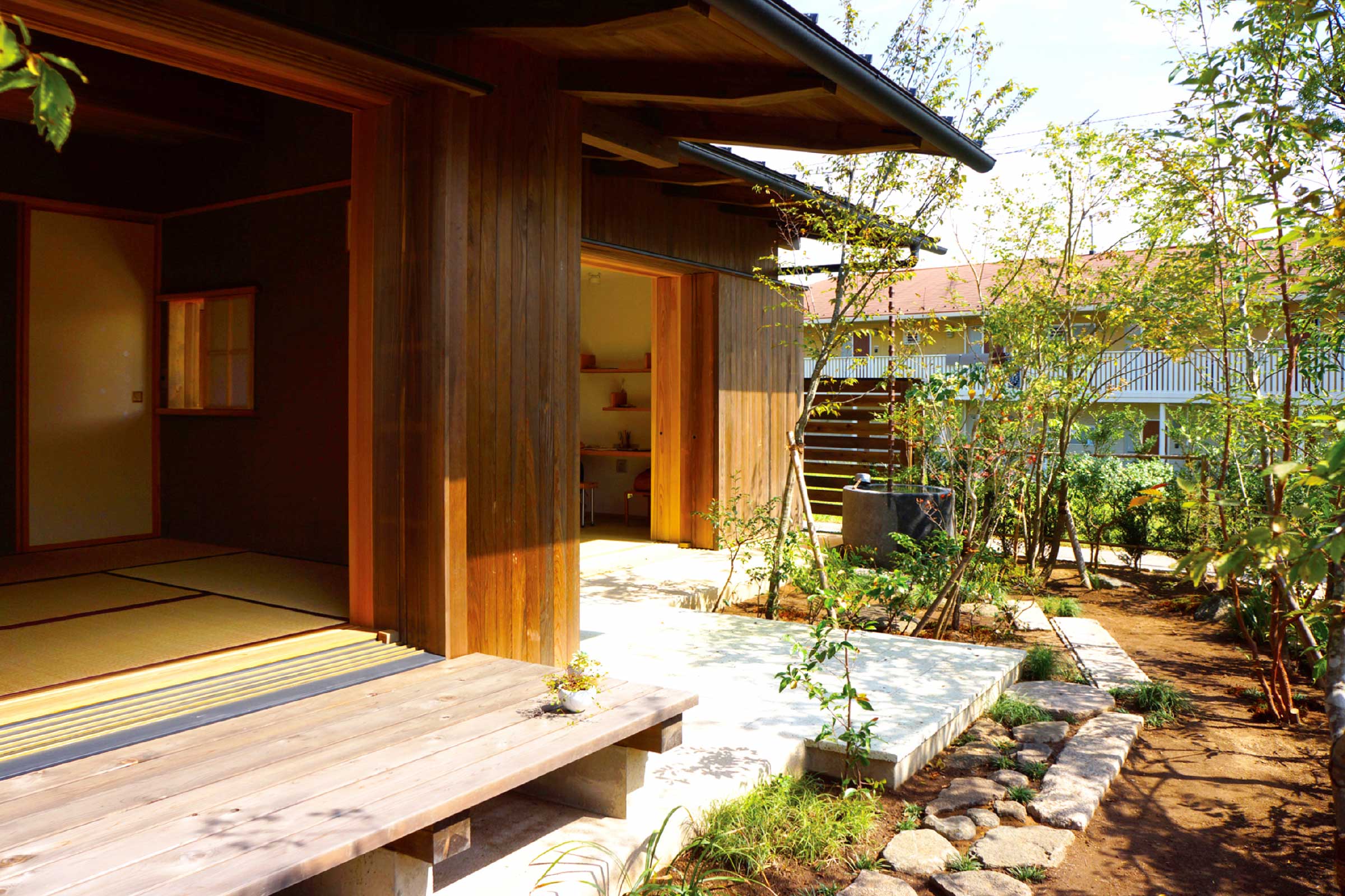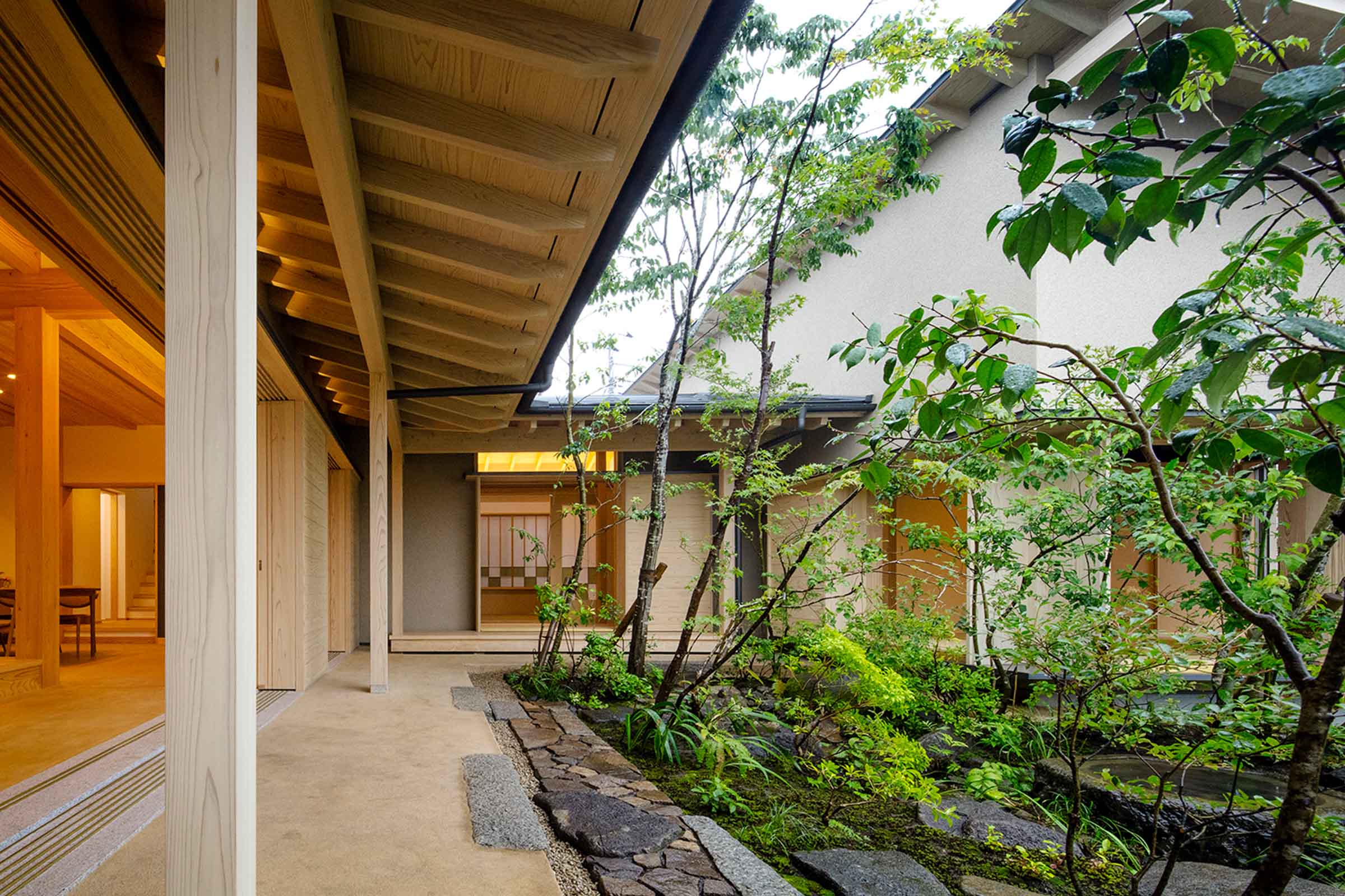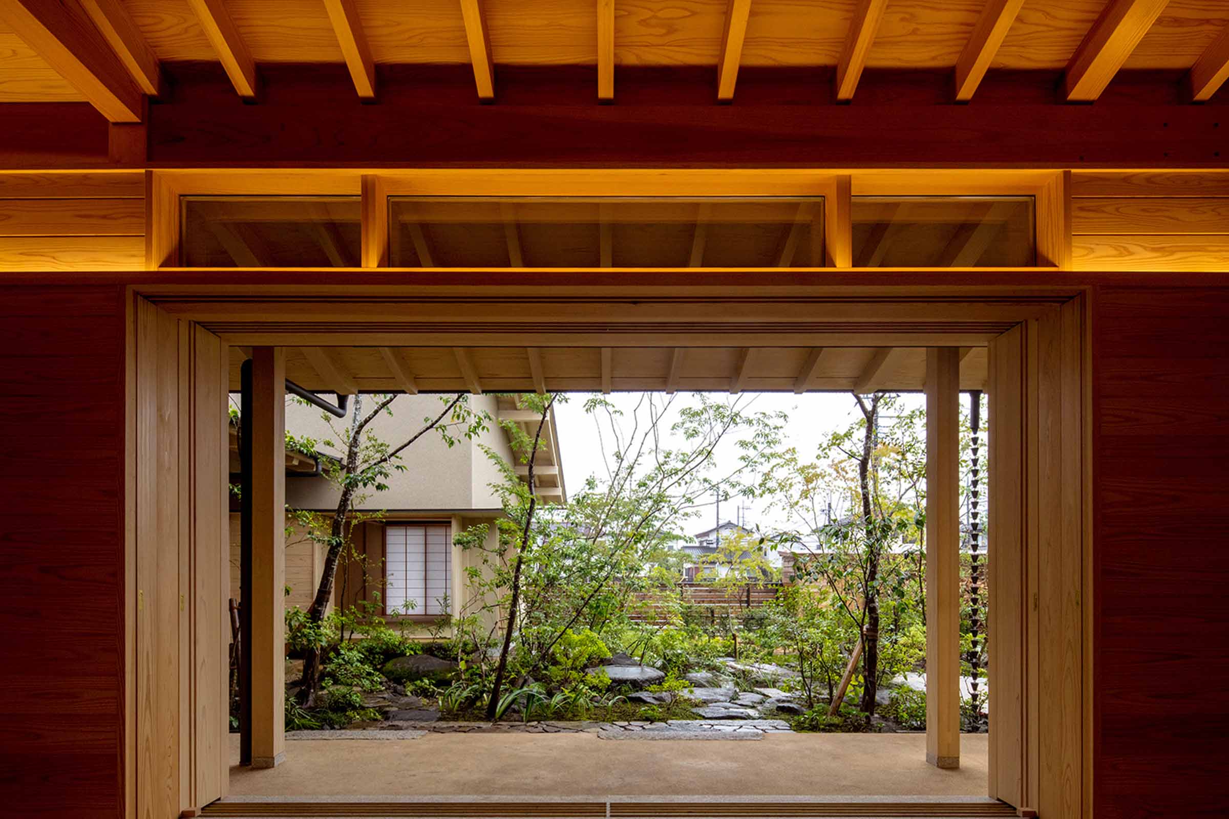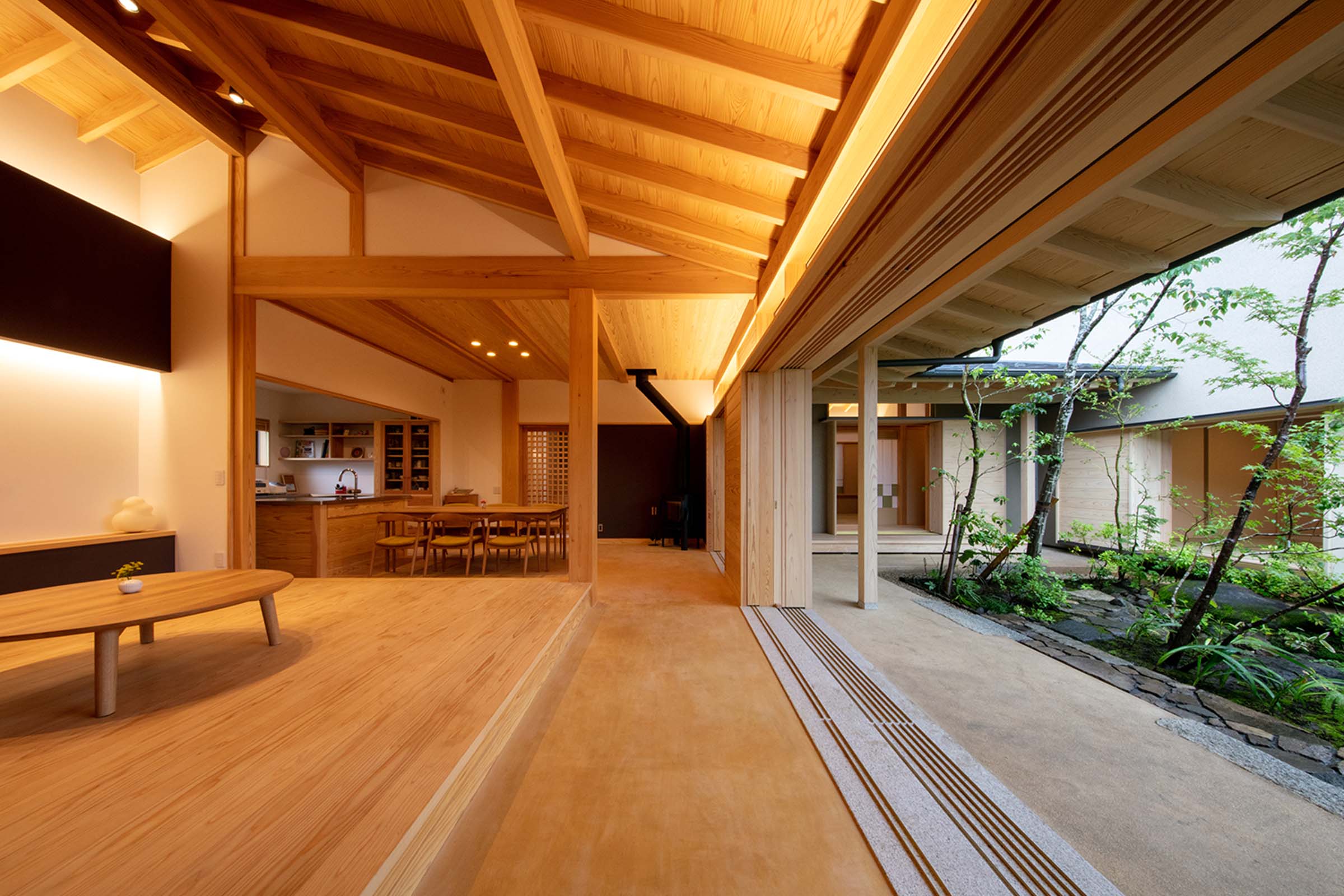 プランは1階の居間に重心を置き、その対となる位置には離れのような客間があり様々な位置から庭を愉しむことができます。