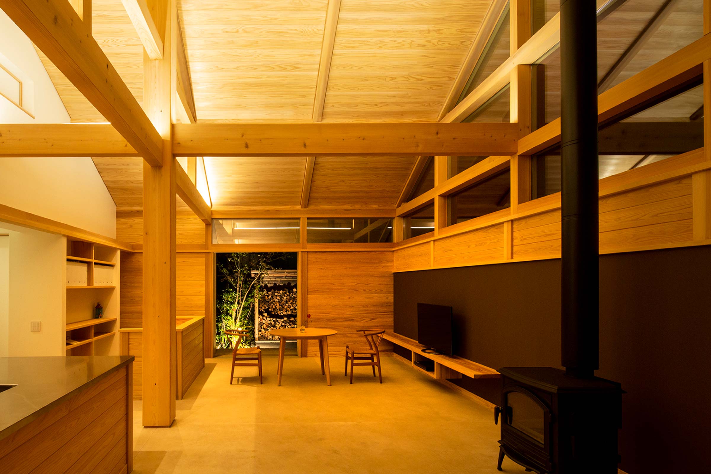 光と緑と薪ストーブの炎、すべてを楽しむ「火」と「陽」の土間です。