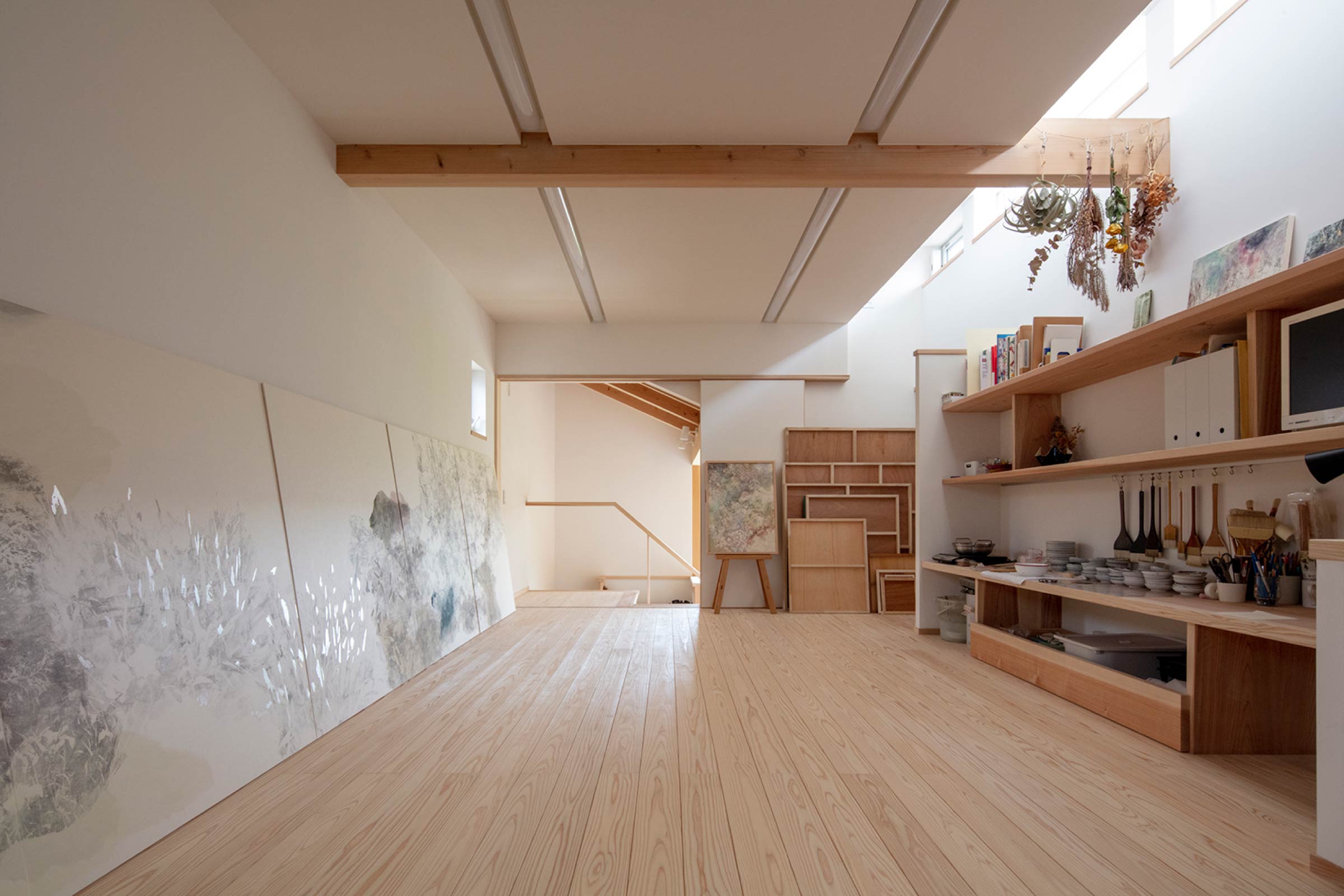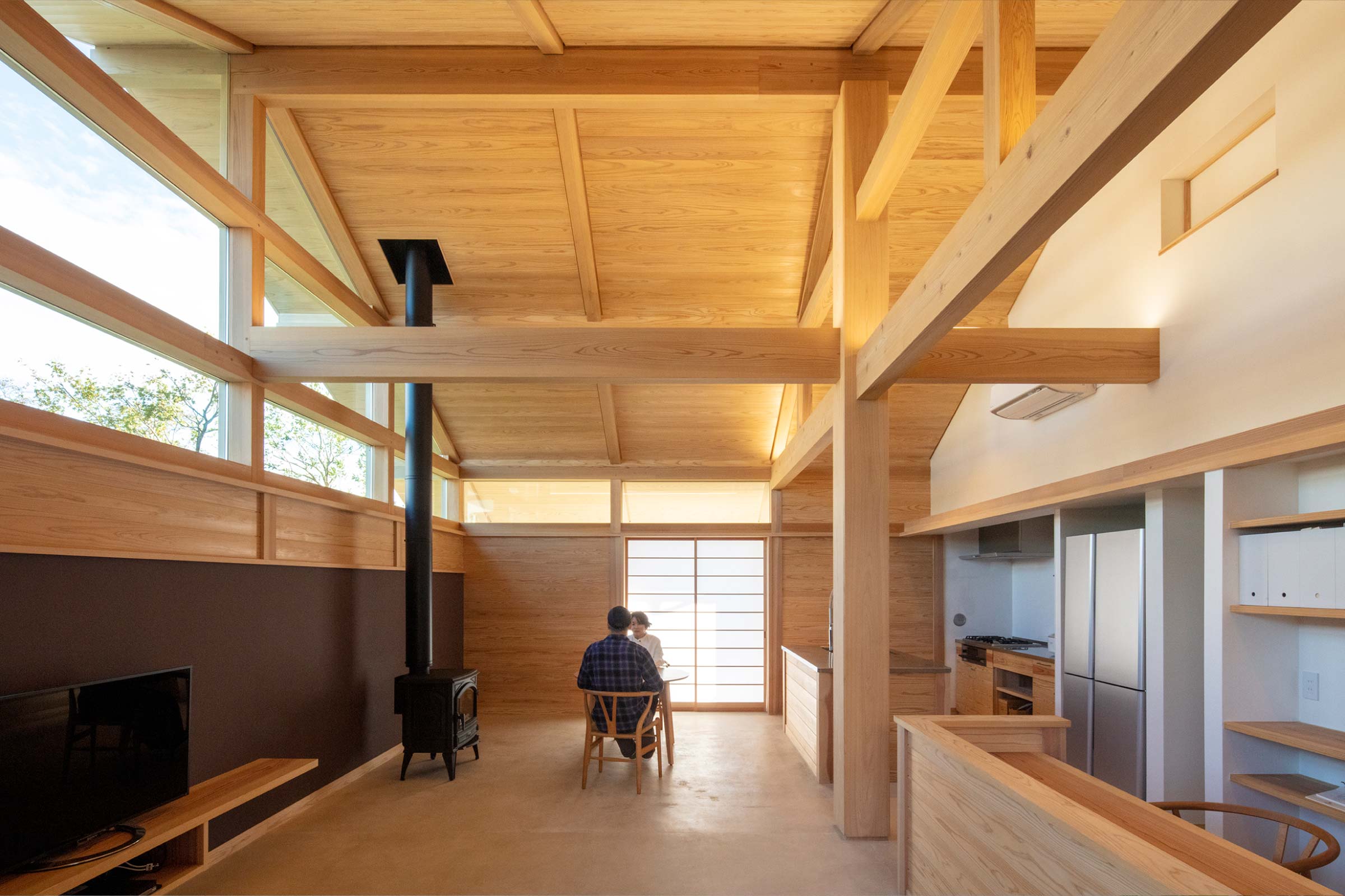 冬場は陽射しの恩恵をパッシブに土間に蓄熱させ、夏場は南北に設けた開口部と深い軒の出、そして雑木の緑が屋内に涼しい風を通します。