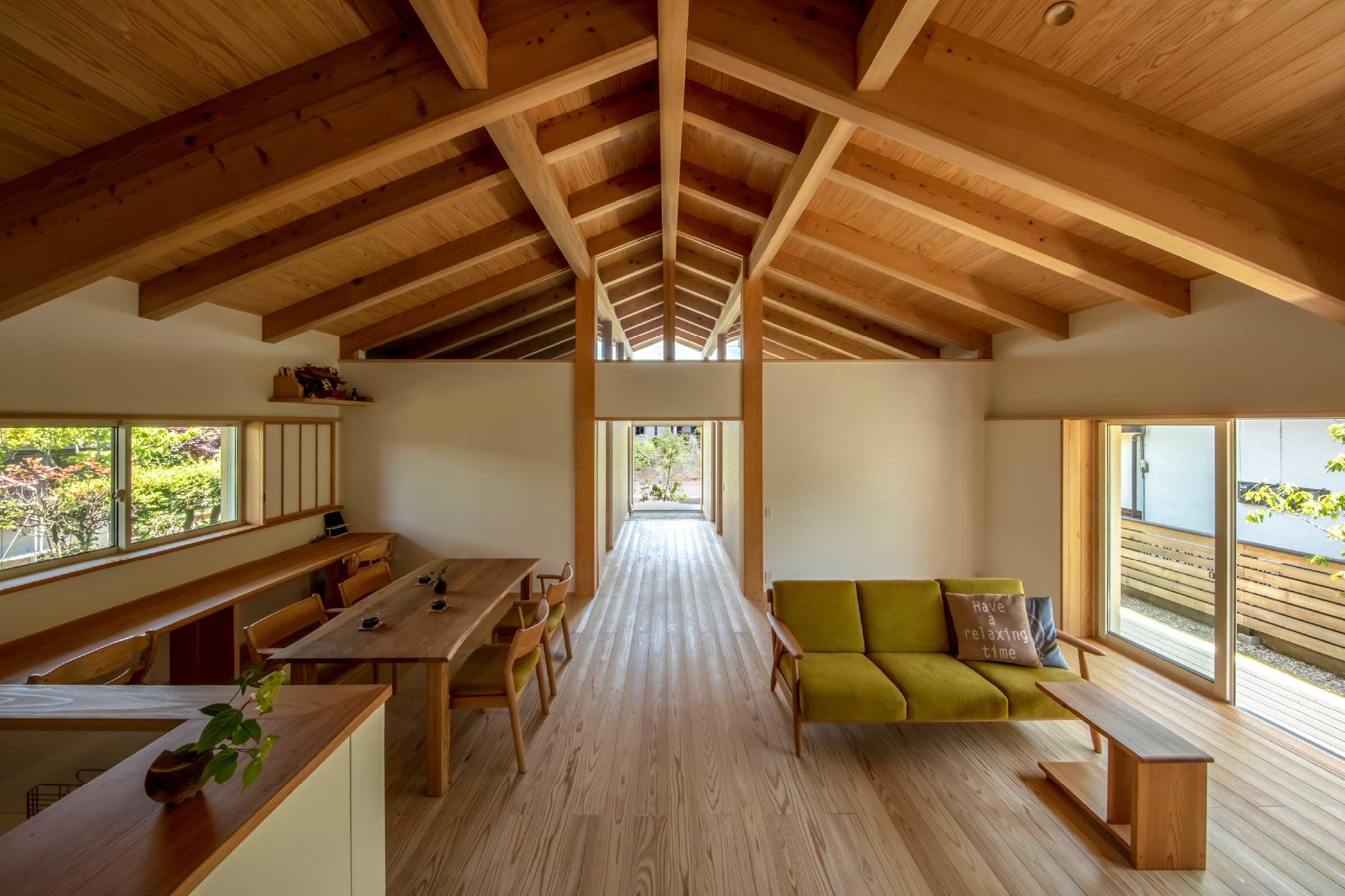 道路に面しては矢切り部分が大工技術の粋を集めた構造美を表し、近隣住民や通行人に地域材を使用した木造住宅の良さを伝えます。