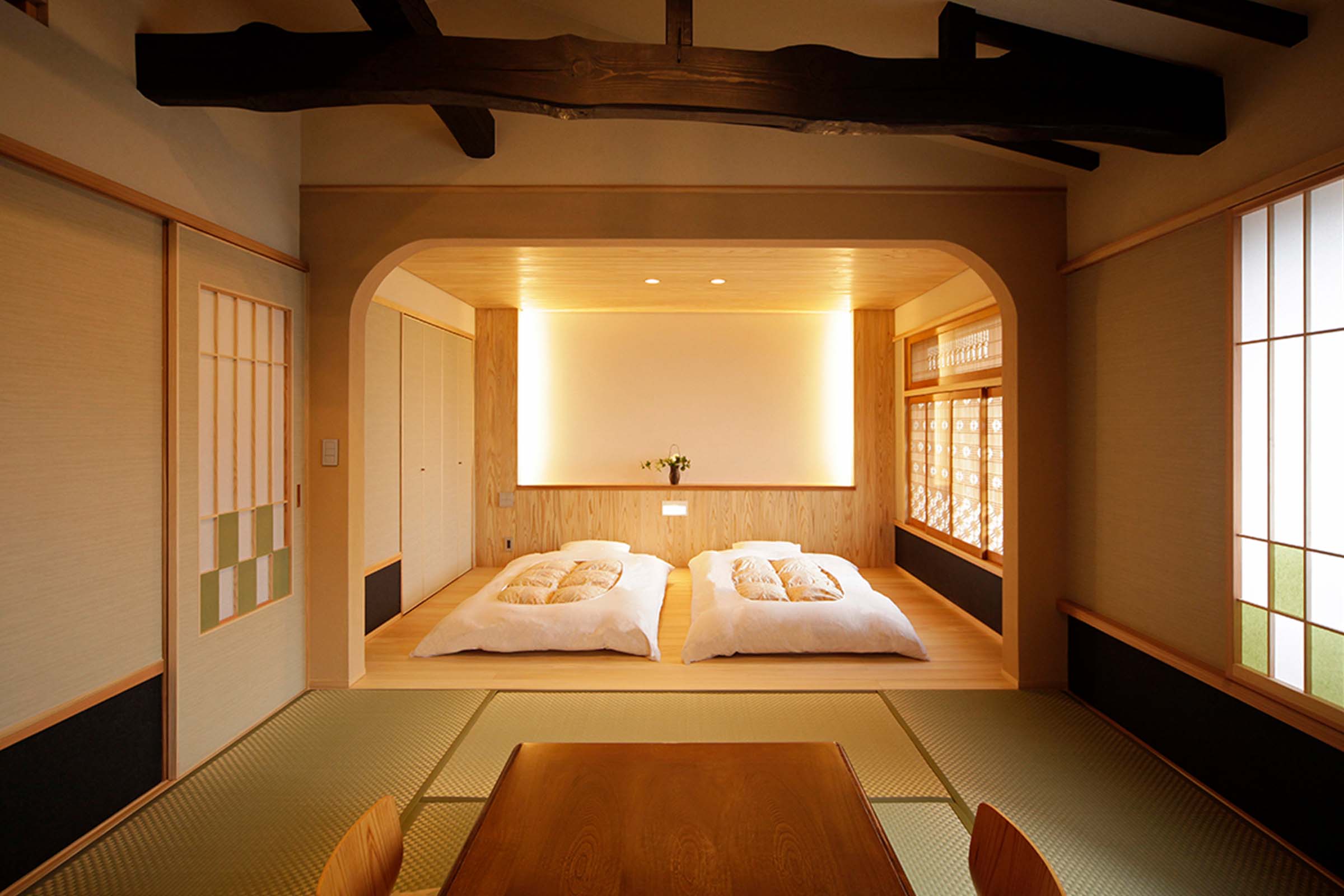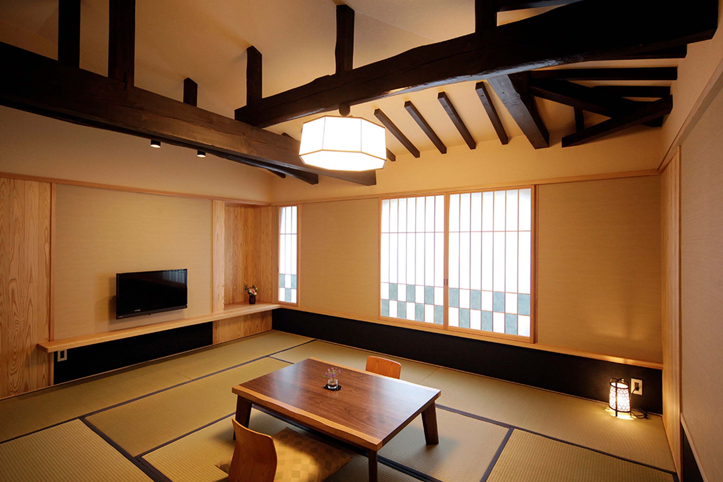 3つの部屋は「山」・「川」・「月庭」と名付けられ、既存躯体と旅館周辺の趣を伝える設えとなりました。